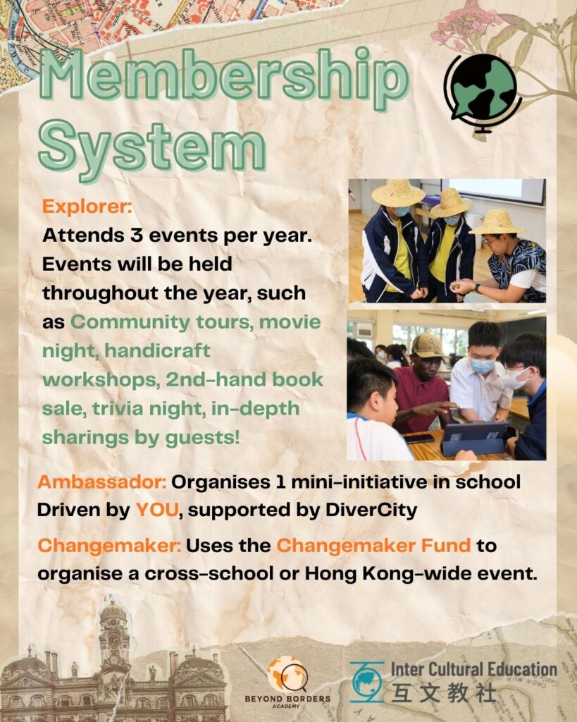 DiverCity, a portmanteau of the words “diverse” and “city”, is a Hong Kong-based youth group, funded by Beyond Borders Academy and supported by Inter Cultural Education Ltd., which aims to cultivate students’ curiosity about different cultures and perspectives, as well as empower them with resources to advocate for global issues. In an increasingly interconnected and polarized world, we believe only genuine curiosity about diverse perspectives can bridge divides. Through our cross-cultural workshops and micro-grant program, we empower students to explore diverse perspectives and launch their own advocacy initiatives.